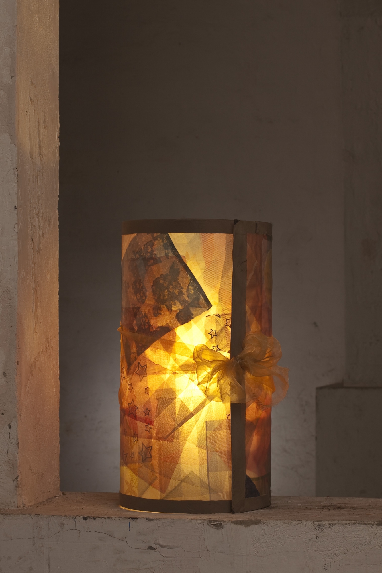Statt mit Süßigkeiten möchte diese überdimensionale Bonbondose mit Licht gefüllt werden. Sie soll auf einer festen Unterlage stehen, z.B. Tisch oder Boden, da sie nicht nur oben, sondern (zum Naschen durchaus vorteilhaft) auch unten offen ist sowie an einer Stelle senkrecht geschlitzt. Deshalb läßt sie sich, nach Belieben überlappend, ineinander schieben und damit schmählern oder auseinander ziehen bzw. voluminöser machen. Auch mit Kerzen als Lichtquelle sehr schön.