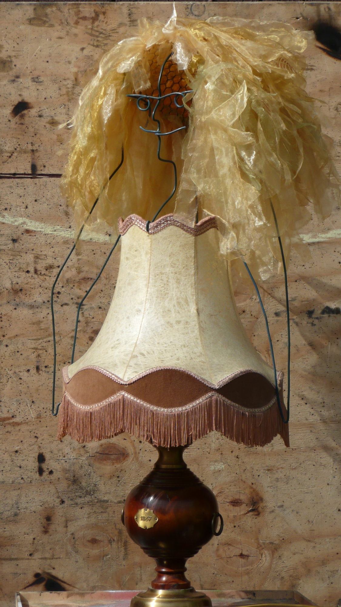 Material: Lampenschirm, Draht, Organza, Holz, Metall
