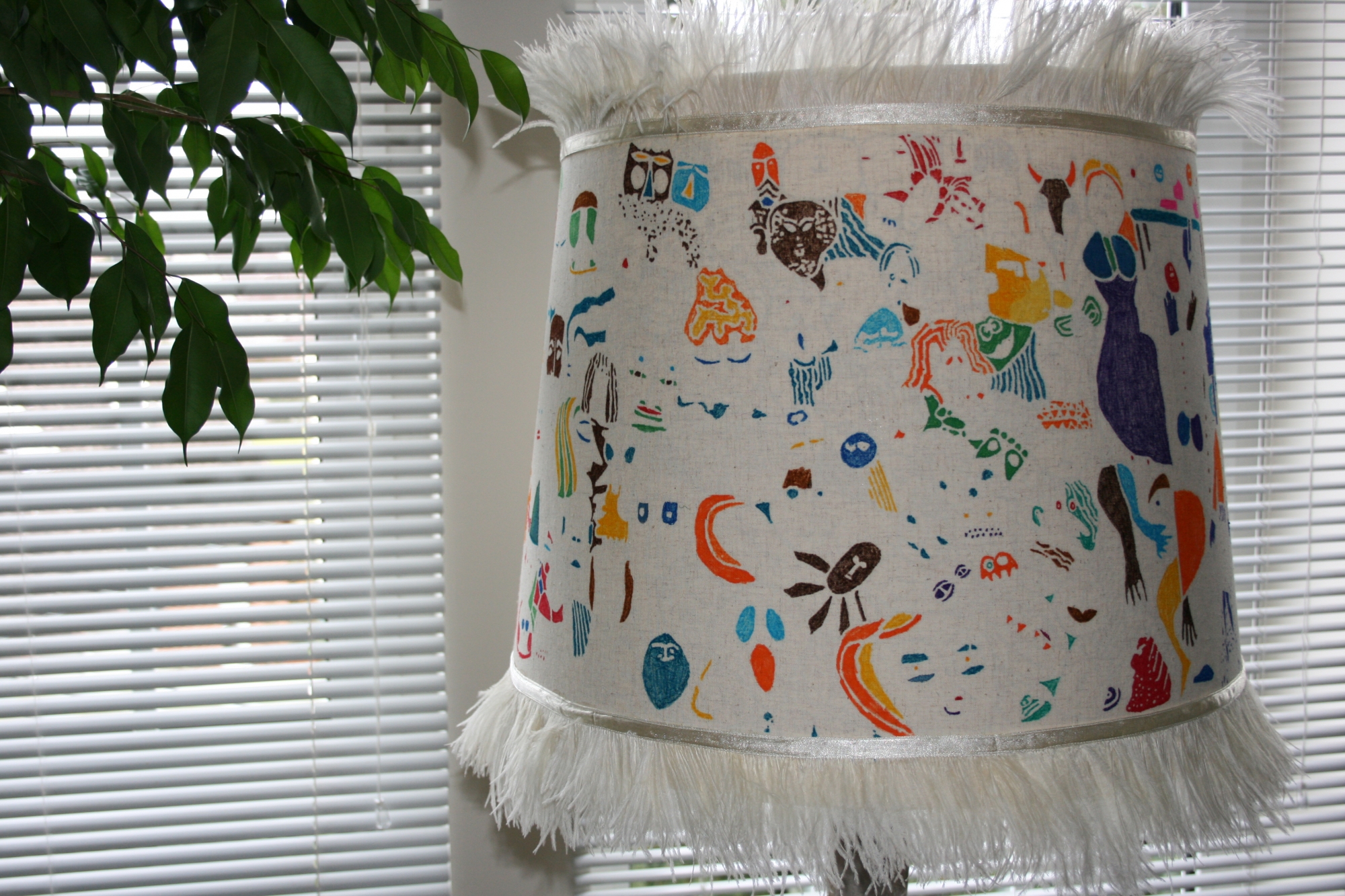 Material: Holz, Lampenschirmseide auf Hartfolie, Filzstiftmalfarbe, Federbordüre, Textilien